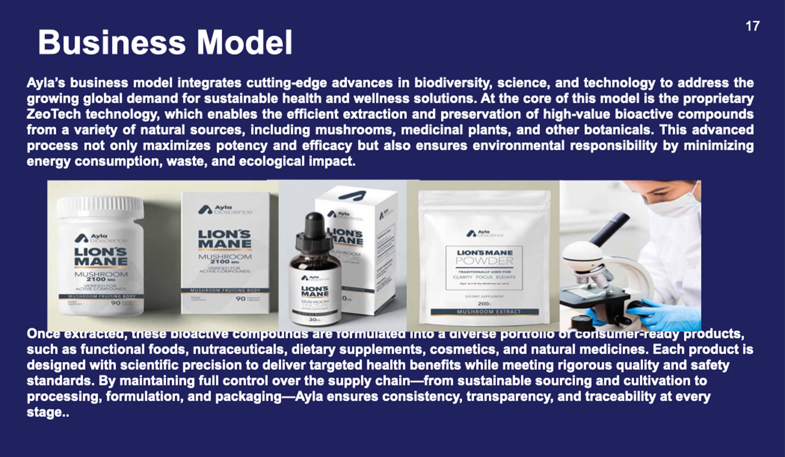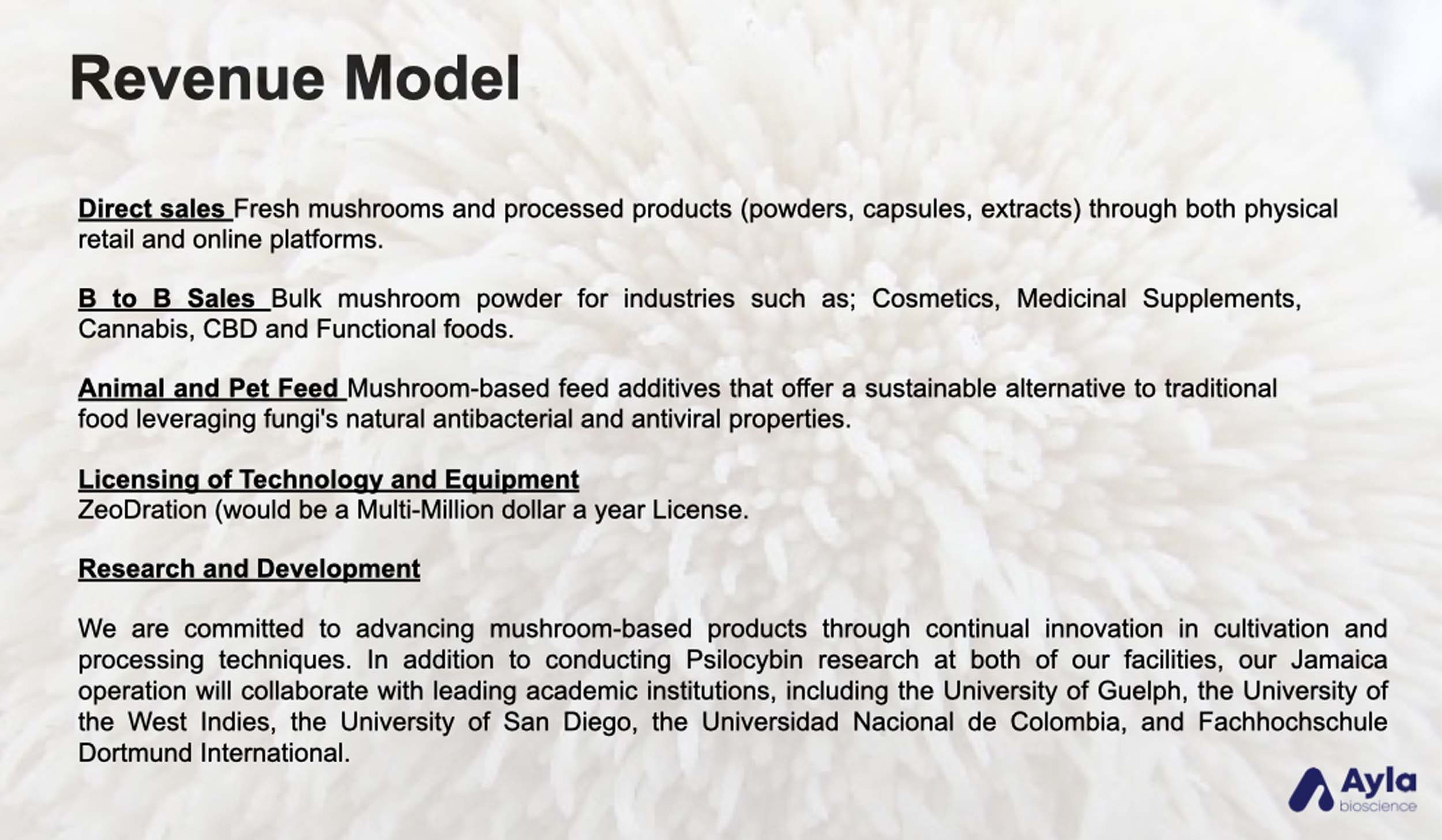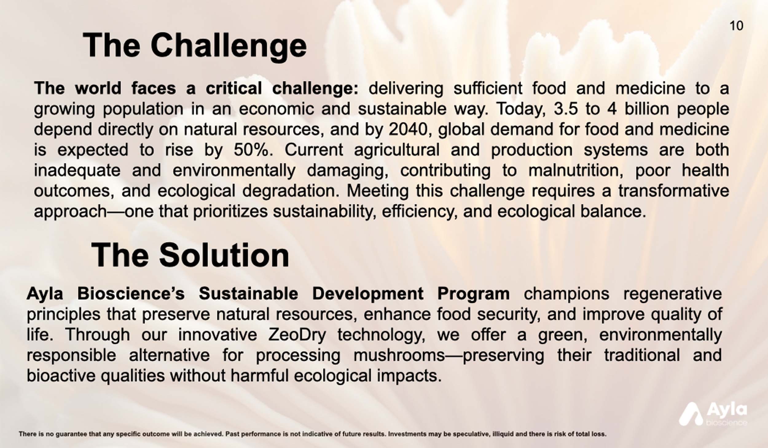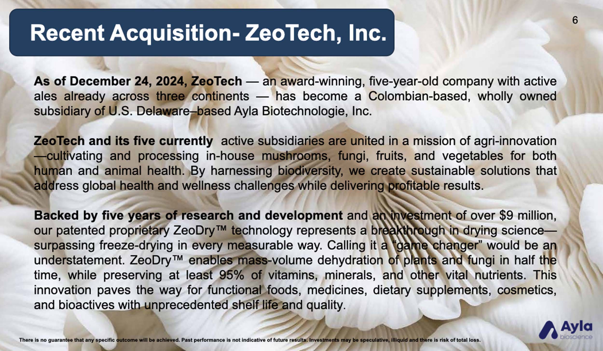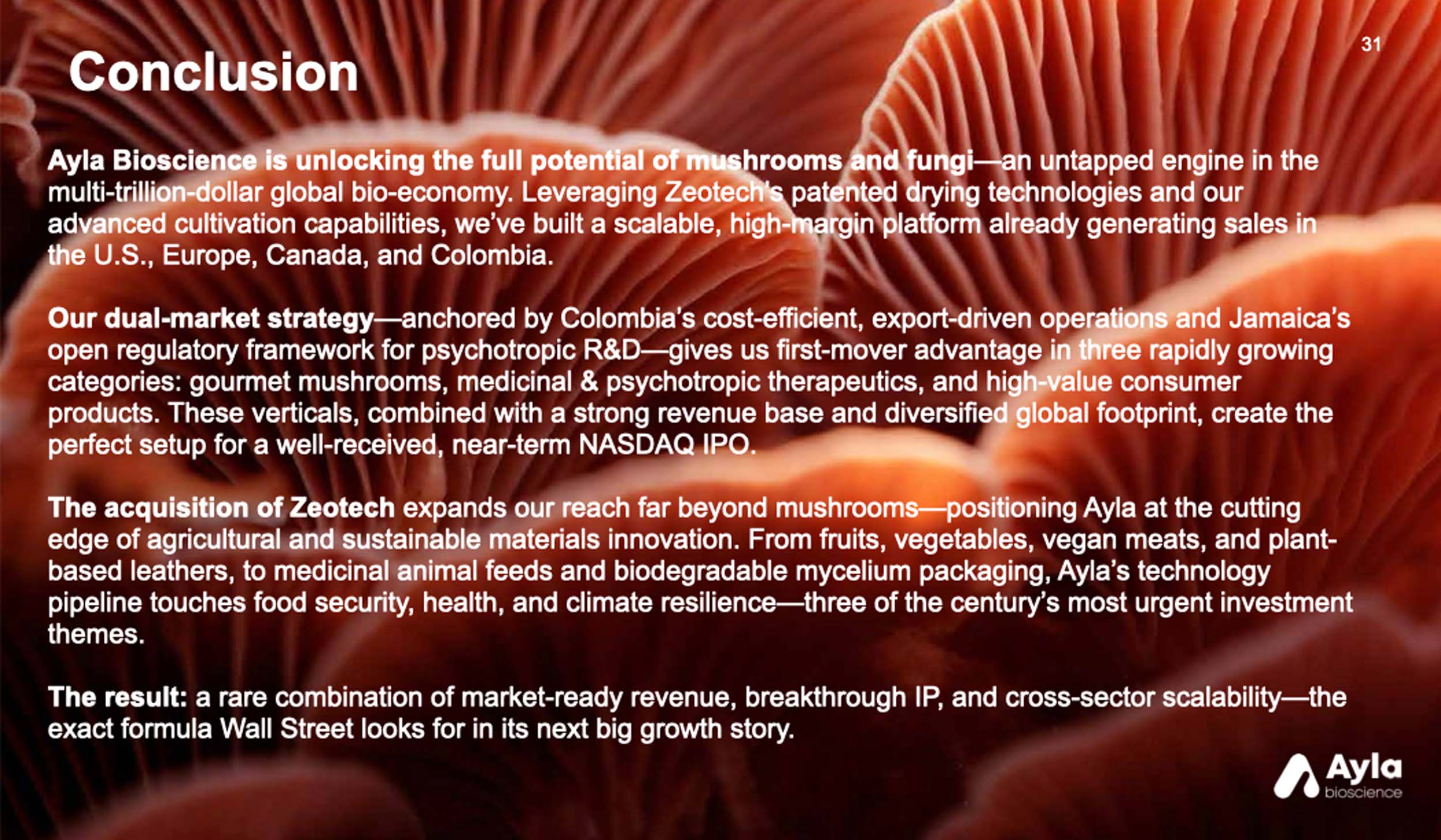 The acquisition of Zeotech expands our reach far beyond mushrooms—positioning Ayla at the cutting edge of agricultural and sustainable materials innovation. From fruits, vegetables, vegan meats, and plant- based leathers, to medicinal animal feeds and biodegradable mycelium packaging, Ayla’s technology pipeline touches food security, health, and climate resilience—three of the century’s most urgent investment themes.
