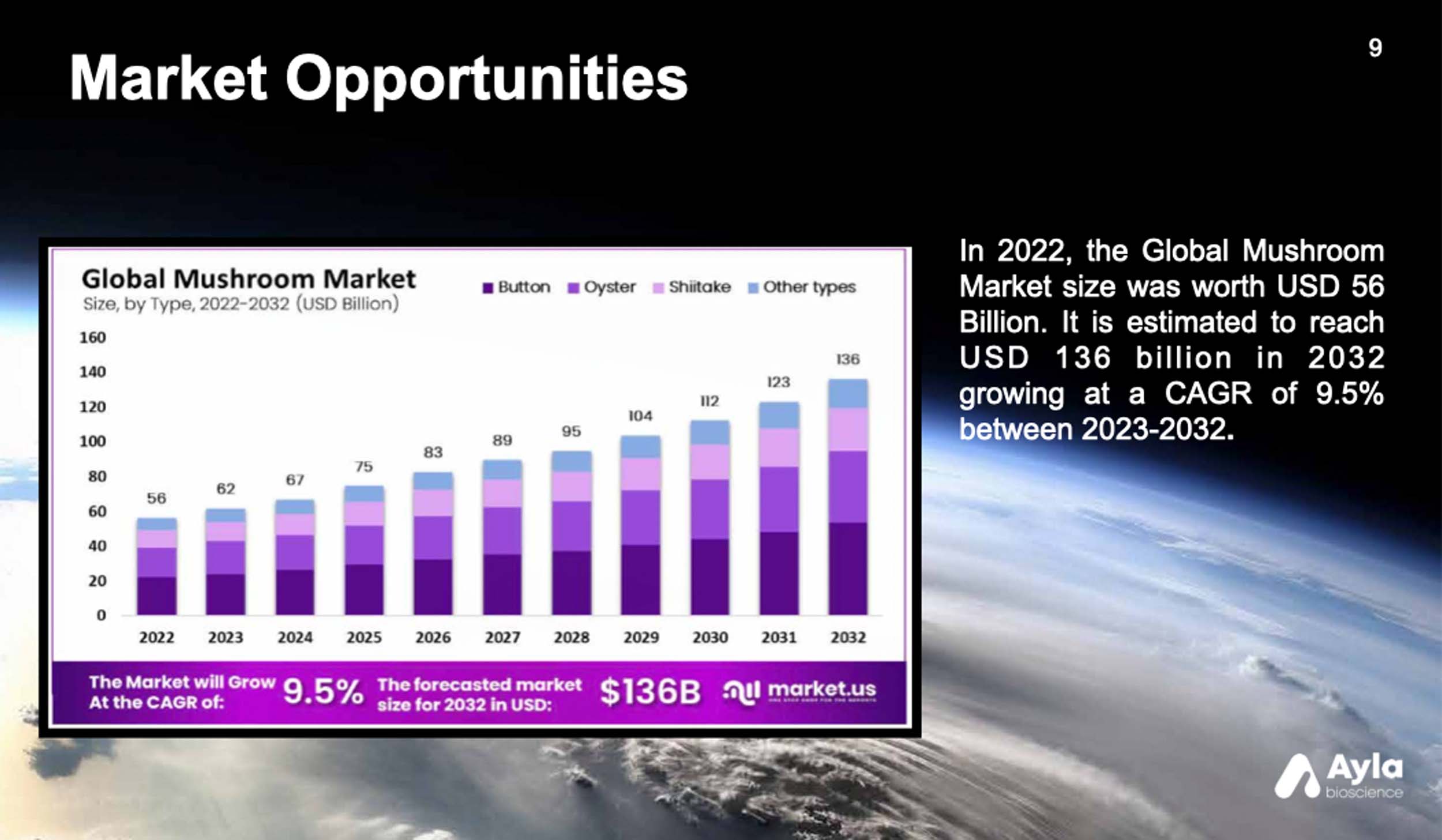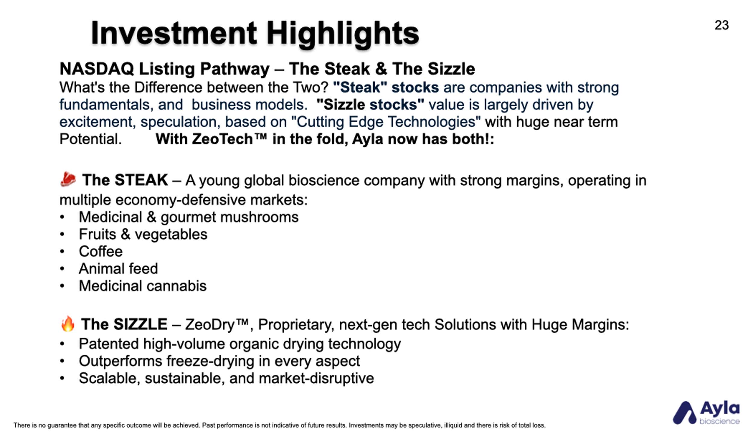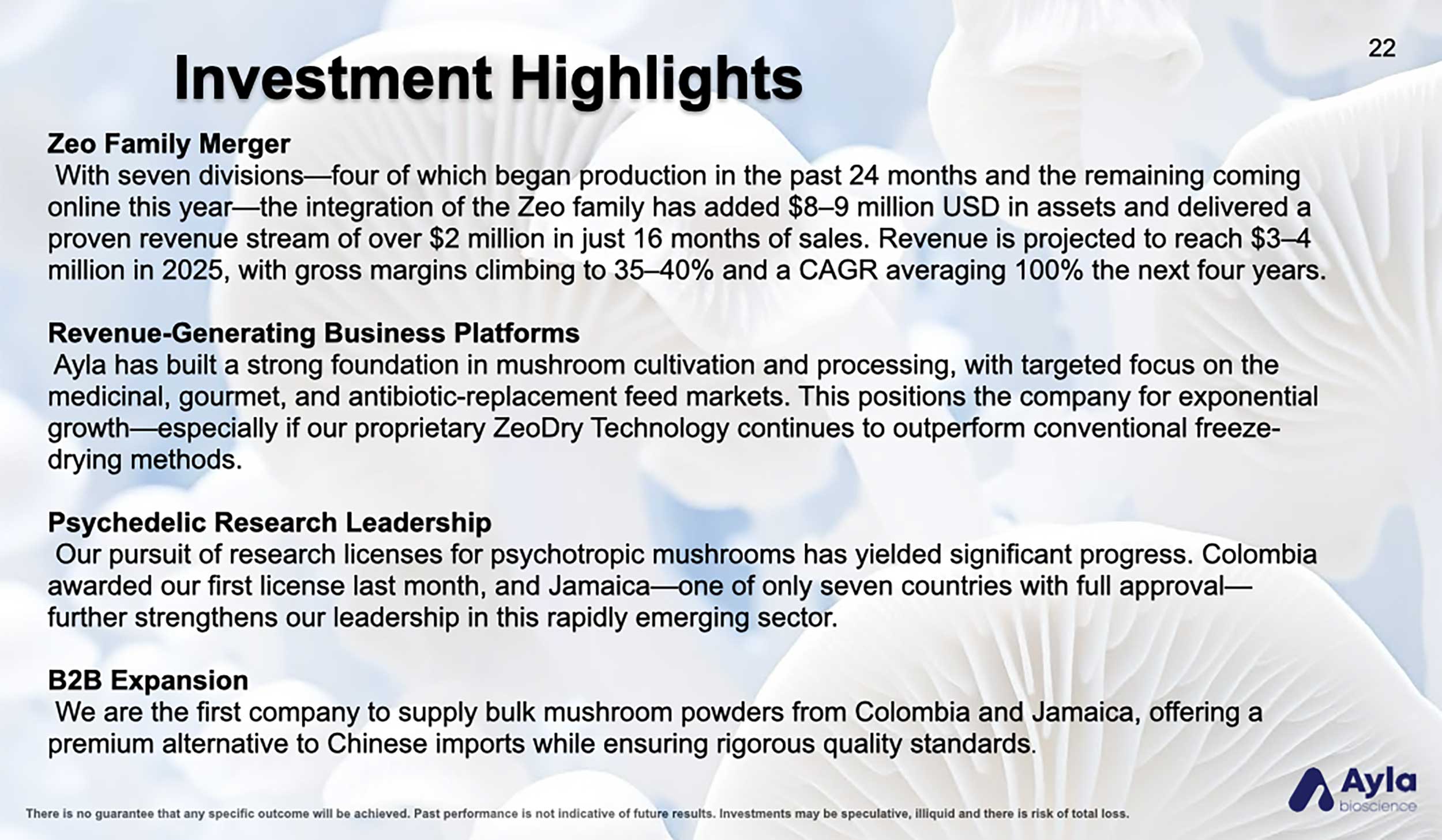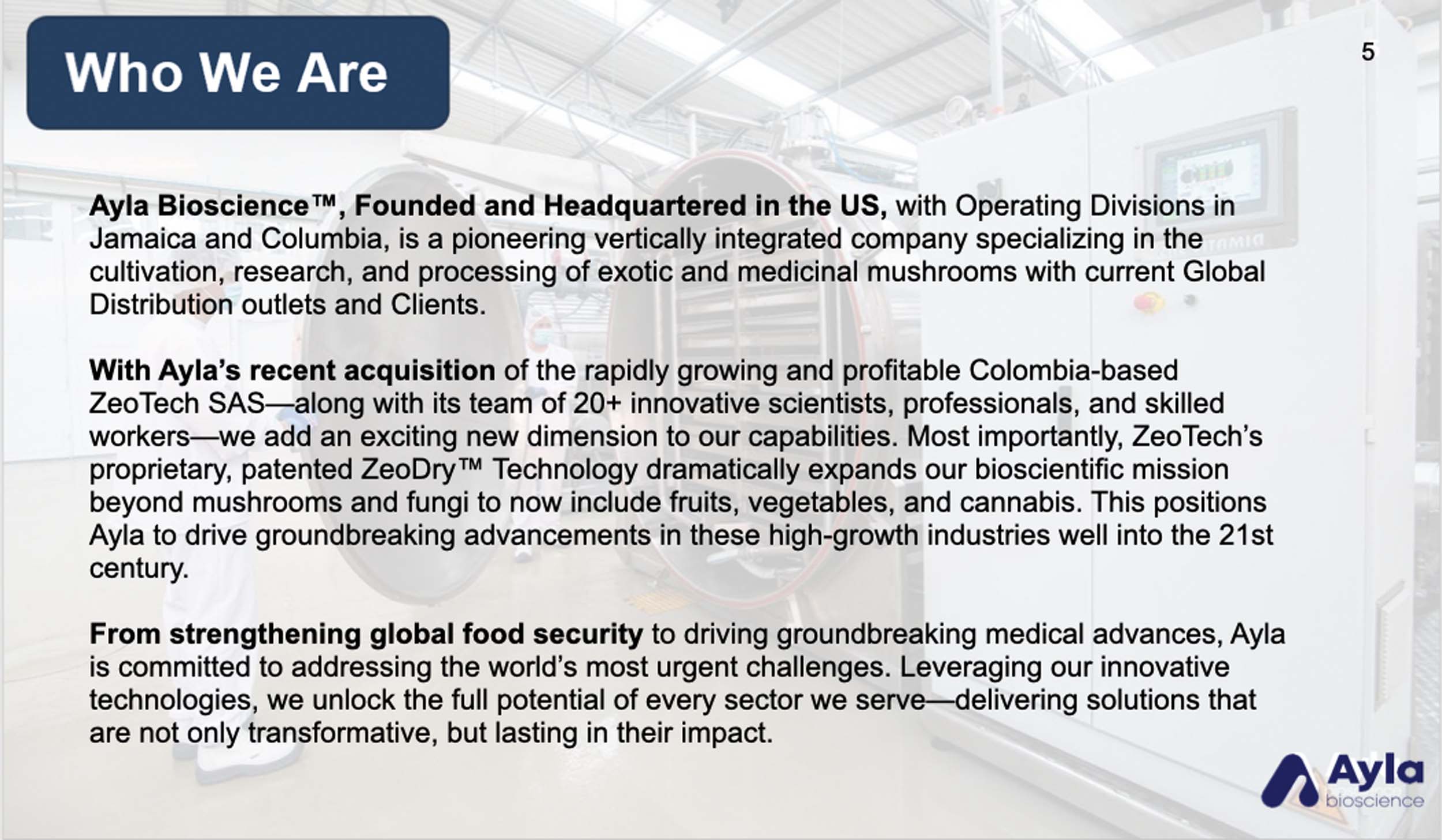 The acquisition of Zeotech expands our reach far beyond mushrooms—positioning Ayla at the cutting edge of agricultural and sustainable materials innovation. From fruits, vegetables, vegan meats, and plant- based leathers, to medicinal animal feeds and biodegradable mycelium packaging, Ayla’s technology pipeline touches food security, health, and climate resilience—three of the century’s most urgent investment themes.