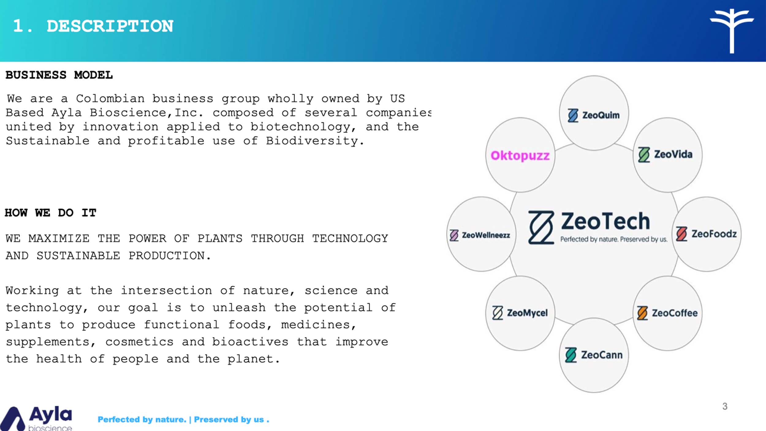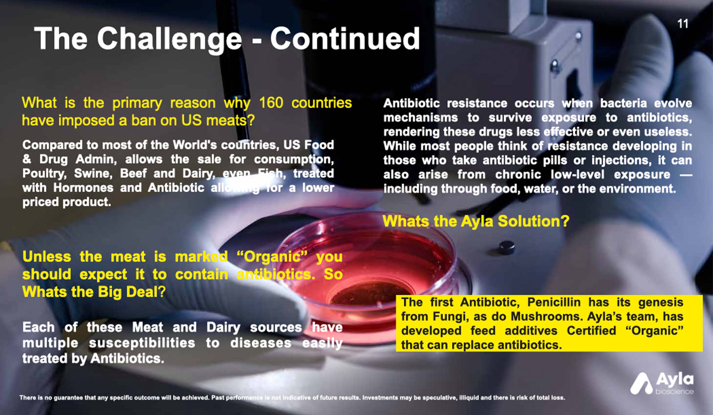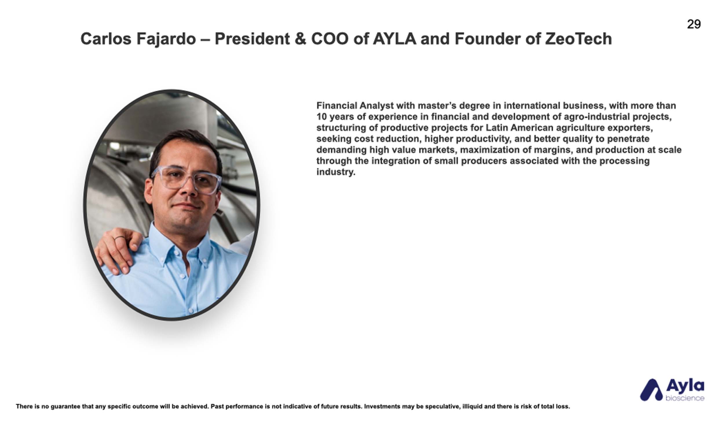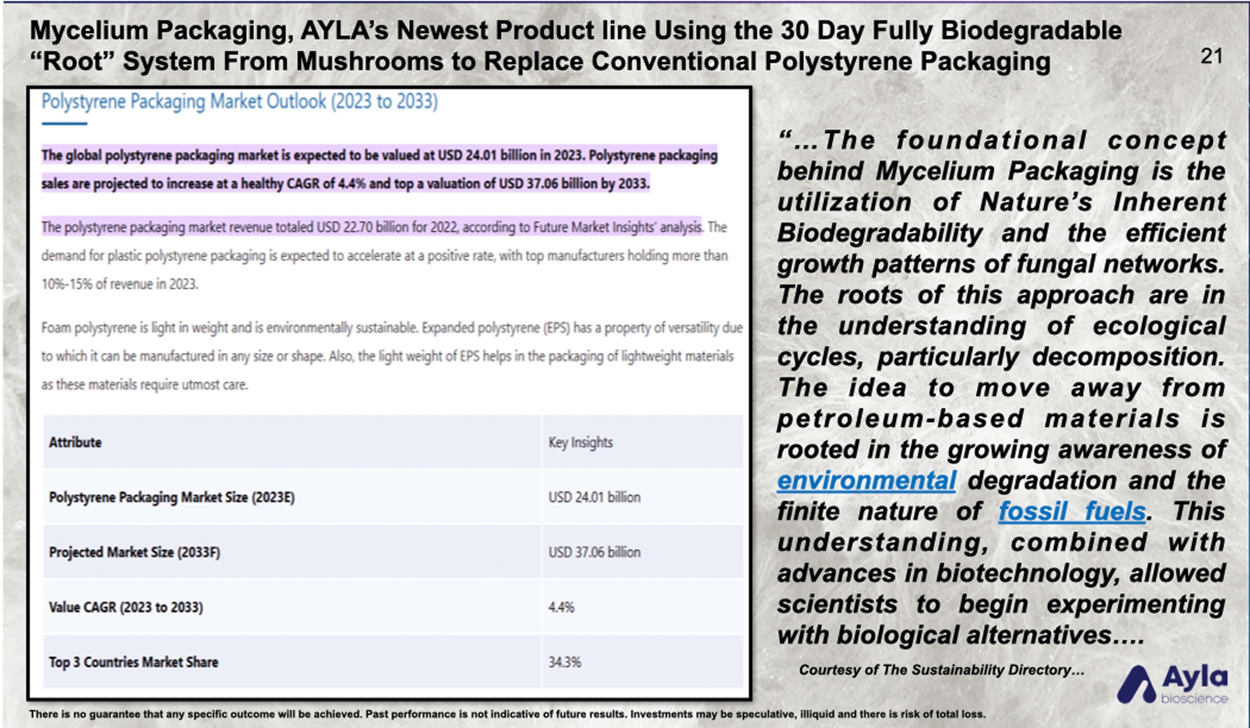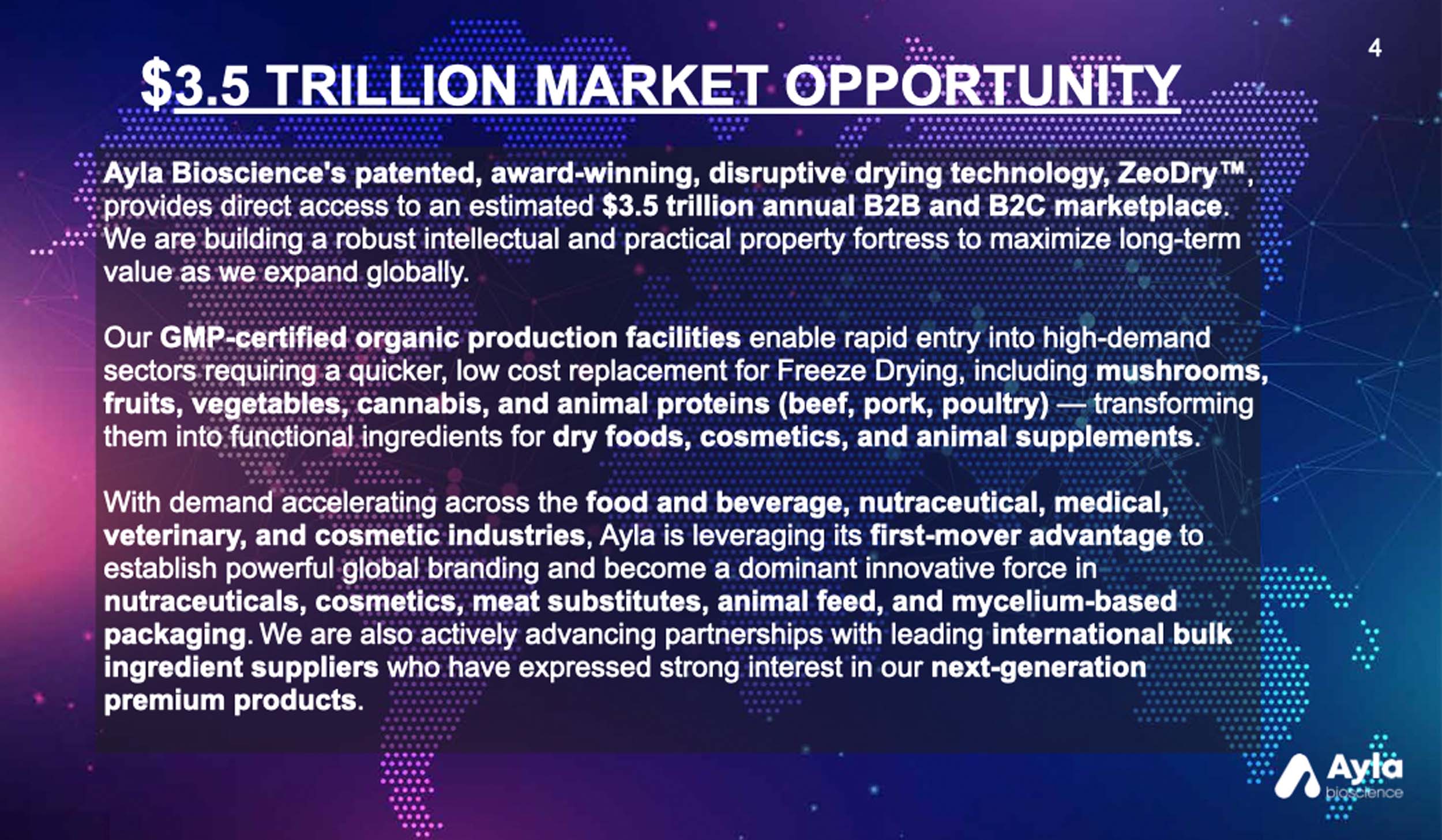 The acquisition of Zeotech expands our reach far beyond mushrooms—positioning Ayla at the cutting edge of agricultural and sustainable materials innovation. From fruits, vegetables, vegan meats, and plant- based leathers, to medicinal animal feeds and biodegradable mycelium packaging, Ayla’s technology pipeline touches food security, health, and climate resilience—three of the century’s most urgent investment themes.
